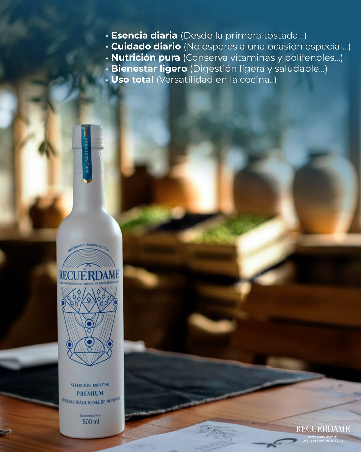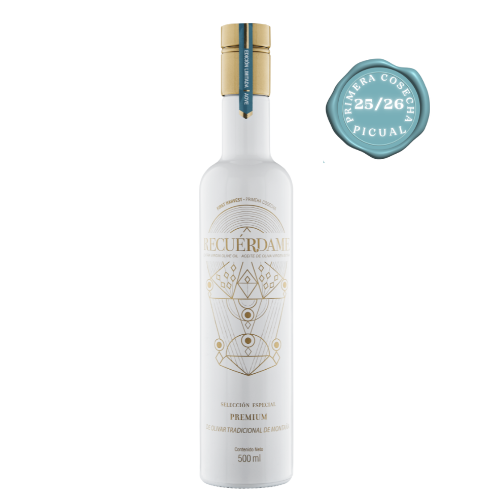 Este aceite, principalmente de la variedad Picual con toques de Royal, suaviza el amargor y picante, potenciando las sensaciones en boca.