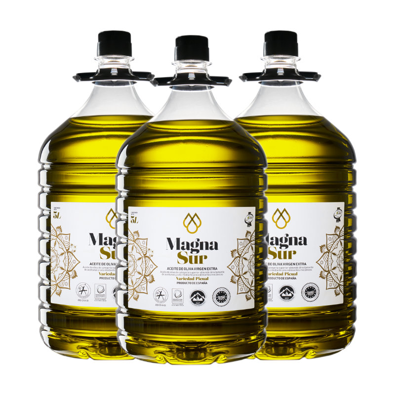 Aceite de Oliva Virgen Extra de Sierra Mágina, presentado en una práctica caja con 3 garrafas de 5 litros.