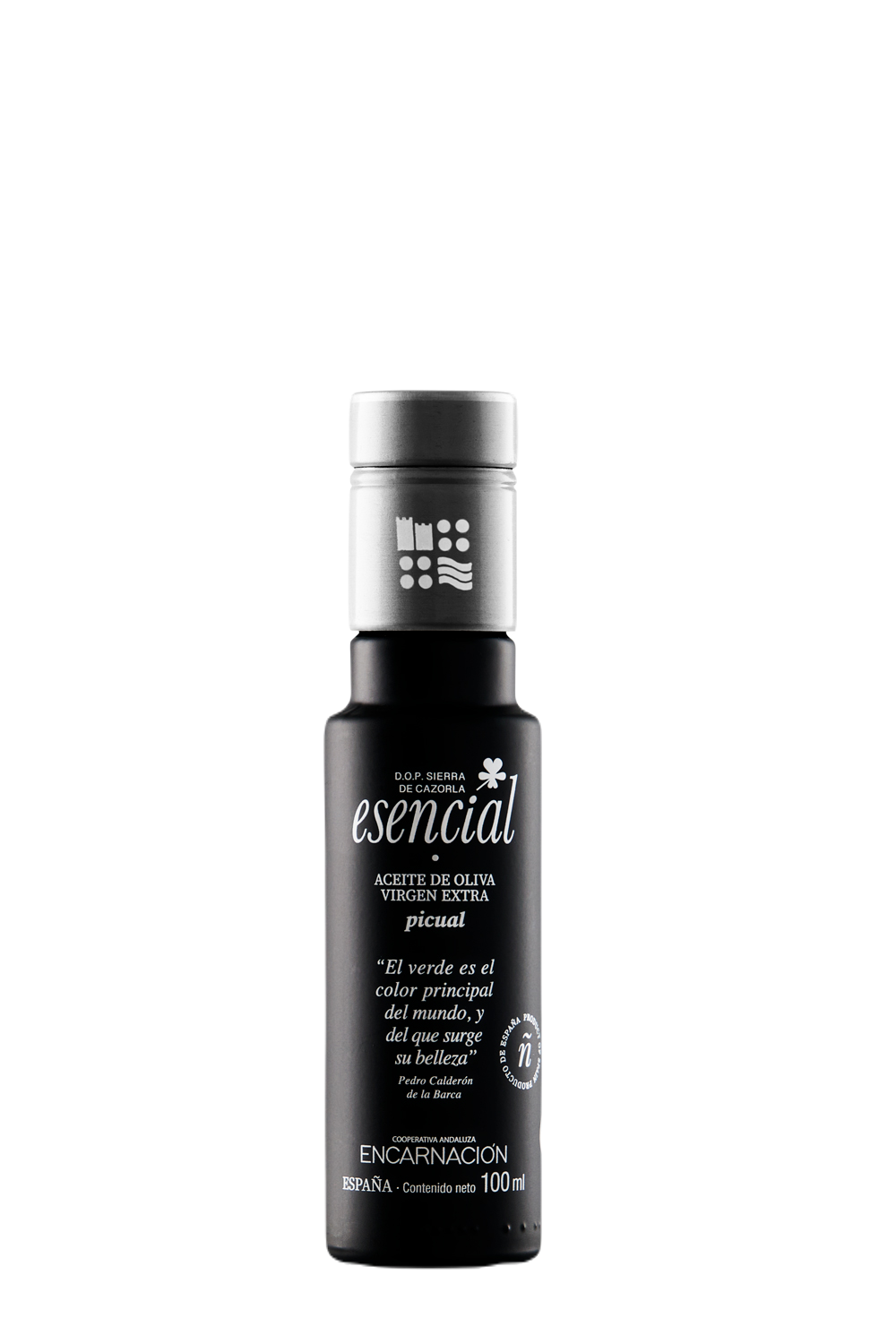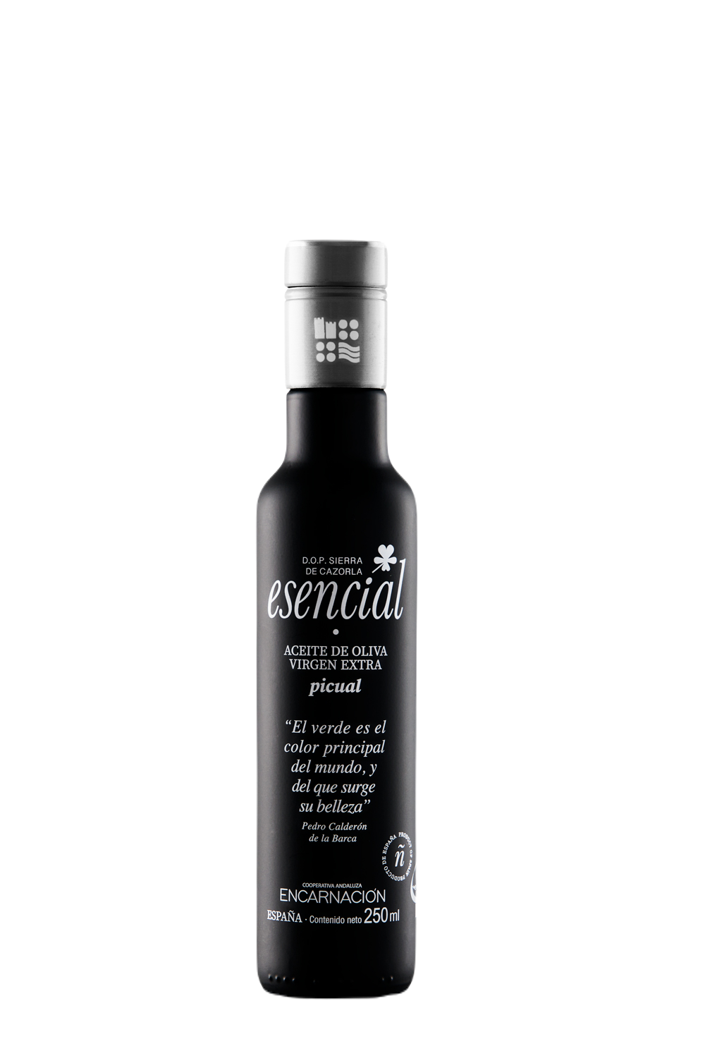 Esencial es un aceite de oliva virgen extra picual de RECOLECCIÓN TEMPRANA con Denominación de Origen Sierra de Cazorla, recolectado y producido a finales de octubre. Aceite de Oliva Virgen Extra (monovarietal Picual). El Picual es aceite de gran cuerpo, con sabor amargo y picante intermedios y equilibrados, de frutado intenso, sin ningún tipo de defecto. Es también habitual que aparezcan las notas verdes en su aroma, con frutado a tomatera y alloza. Entre sus mejores cualidades está su gran resistencia al enranciamiento, gracias a la significativa cantidad de vitamina E que posee. Denominación de Origen: Sierra de Cazorla