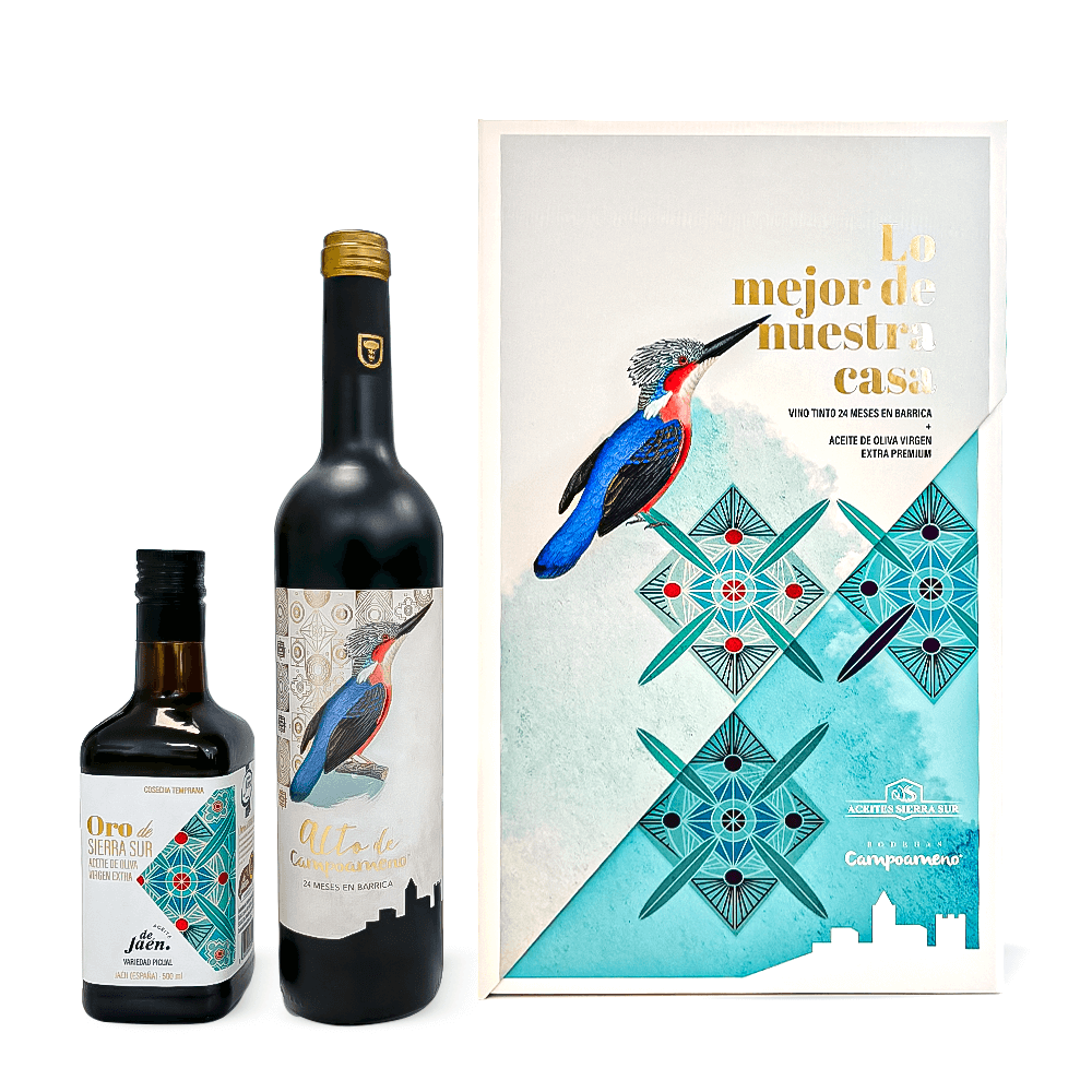 ESTUCHE LO MEJOR DE NUESTRA CASA; incluye  una botella de Vino Alto de Campoameno y Aceite de Oliva Virgen Extra Oro de Sierra Sur