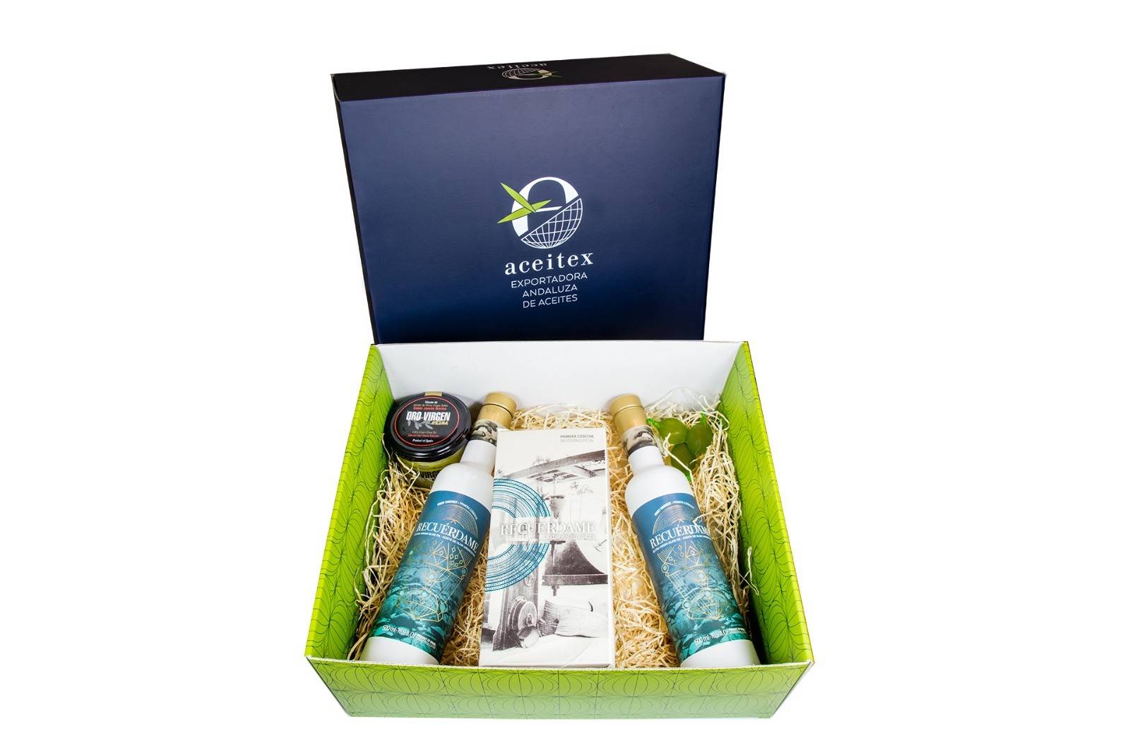 Aceite de oliva virgen extra Recuérdame, de variedad picual. Contenido del estuche: