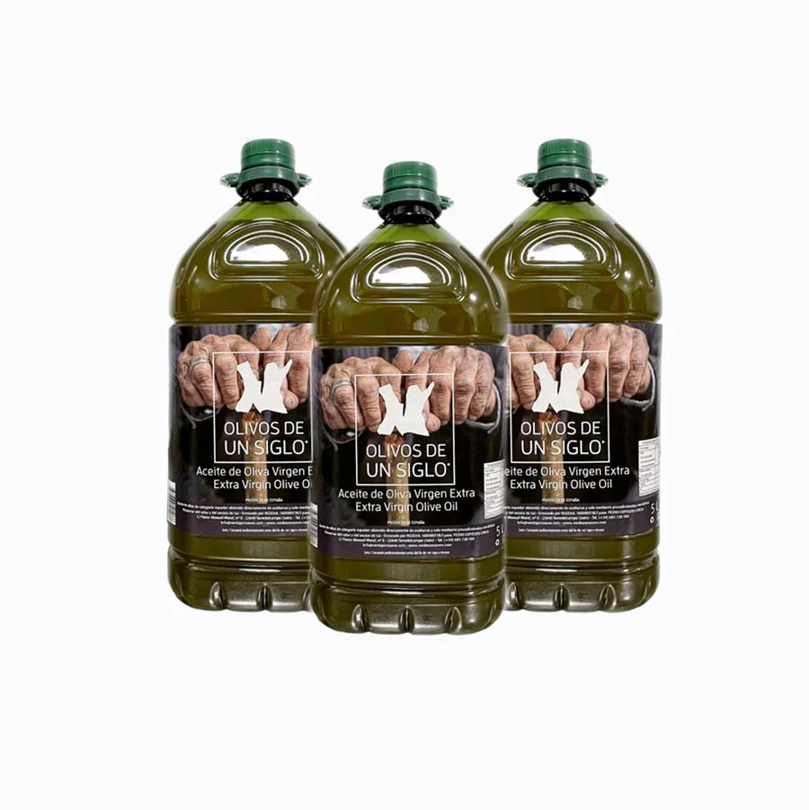 Aceite de oliva virgen extra Olivos de un siglo, se presenta en formato de garrafa de PET de 5 litros.
