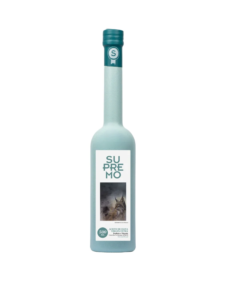 Aceite de oliva virgen extra Supremo, variedad royal ecológico . Botella de 500 ml.